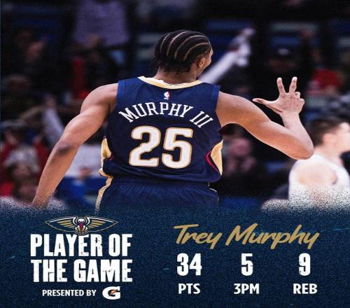 这场比赛,鹈鹕球星特雷墨菲三世打出了相当不错的个人表现:全场出战38分钟,投篮22中12,三分13中5,罚球7中5,拿下34分9篮板5助攻2盖帽1抢断,且没有出现1次失误。